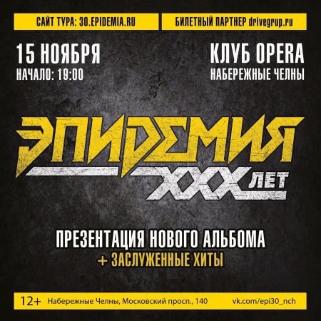 15 ноября 2025 года в клубе «Opera» города Набережные Челны состоится концерт группы «Эпидемия». Три десятилетия эпических битв, огненных риффов и бессмертных хитов — легенда фэнтези-метала, группа «Эпидемия», празднует своё 30-летие!